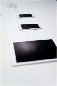 A minimalist arrangement of Apple gadgets including a tablet and smartphones on a white surface.