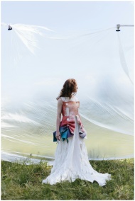 A female model in a conceptual outfit stands outdoors against a plastic backdrop.