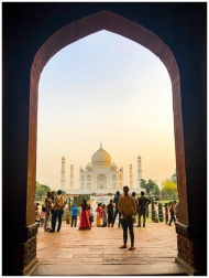 Tourists admire the majestic Taj Mahal framed by an arch at sunset in Agra, India.