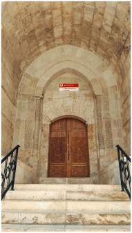 Rustic wooden door set in a historical stone archway in Amasya, Türkiye.