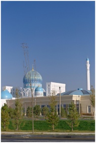 An elegant mosque with striking blue domes and minarets set against a bright clear sky.