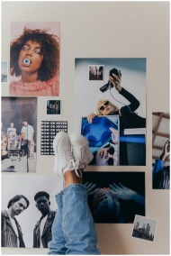 A creative photo composition featuring photos on a wall with legs in sneakers and jeans.