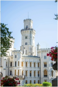 A beautiful historic castle with a floral foregrou