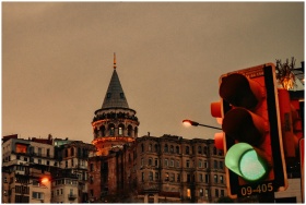 Galata Tower at dusk in Istanbul with green traffic light in foreground