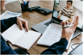 A professional conducting an online class through a video call with a student.
