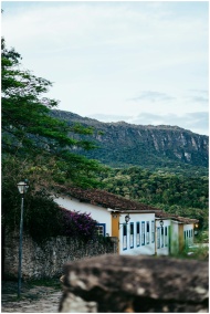 Idyllic view of colonial houses beneath lush mountains in Tiradentes, Brazil. Perfect travel scenery.