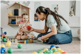 A young girl and woman engaging in an educational play session in a cozy preschool setting.
