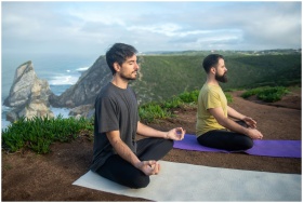 Two men practicing meditation on yoga mats overlooking a scenic cliff in Portugal.
