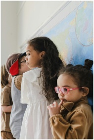School children exploring geography with a large w