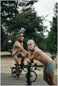 Two young adults on bicycles, enjoying a leisurely