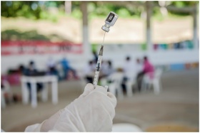 A medical professional prepares a syringe for vaccination in an outdoor clinic setting.