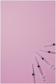 A collection of syringes arranged on a solid pink