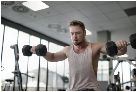 Focused man working out with dumbbells at gym showcasing strength and determination