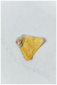 A close-up of a tortilla chip with guacamole dip o