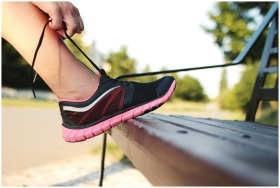 A woman laces her sneakers on a park bench, prepar