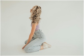 A fashionable woman with curly hair poses in denim jeans against a white background, exuding style and grace.