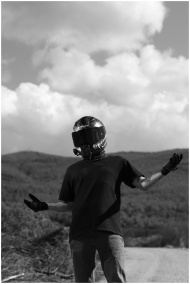 Black and white photo of a motorcyclist posing with arms open on a scenic road.