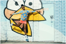 A young woman jumps happily in front of a vibrant graffiti wall featuring cartoon art.