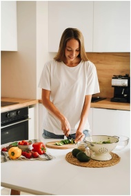 Woman slicing cucumber in a bright kitchen with fr