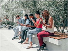 A diverse group of adults sitting outdoors, engrossed in their smartphones, showcasing modern digital life.