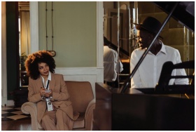 A candid interview between a journalist and a musician by a grand piano indoors.