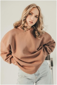 Stylish woman with long hair poses in a brown sweatshirt in a studio setting.