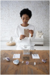 African American woman holding tarot cards with crystals on the table in a serene indoor setting.