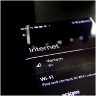 Close-up of a smartphone screen displaying internet connection details with Verizon 5G and Wi-Fi options.