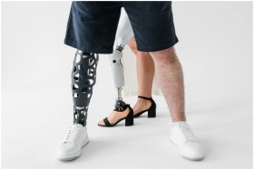 Close-up of diverse prosthetic limbs, showcasing technology in an empowering setup.
