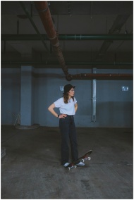 Woman skateboarder standing in an industrial indoor parking lot. Urban lifestyle vibe.