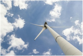 View of a towering wind turbine against a cloudy blue sky, highlighting renewable energy technology.