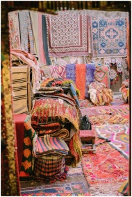 Vibrant handmade rugs and textiles on display in a traditional bazaar setting.