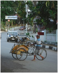 Man pushing a traditional pedicab on an Indonesian