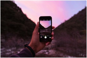 A person photographs a stunning sunset landscape with a smartphone in nature.