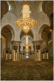 A stunning view of the ornate chandeliers inside the Sheikh Zayed Grand Mosque in Abu Dhabi.