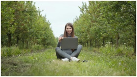 Young woman sits with laptop in an orchard, enjoyi