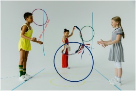 A fun indoor scene with diverse kids playing with colorful hula hoops, emphasizing play and friendship.
