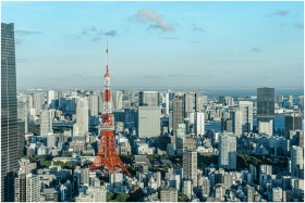 Elevated view of Tokyo cityscape with the iconic Tokyo Tower under a clear blue sky.