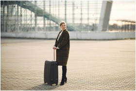 Fashionable woman with suitcase at a modern airpor