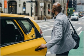 A businessman in a gray suit opens the door of a yellow taxi on a bustling city street, ready for his daily commute.