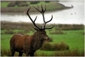 A majestic red deer stag with antlers standing in a lush green field by the water.