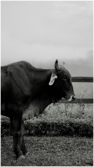 Black and white vertical shot of a bull in the misty Dominican countryside.