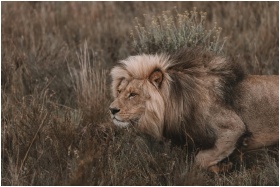 A powerful lion prowling through the grasslands, showcasing its majestic mane.