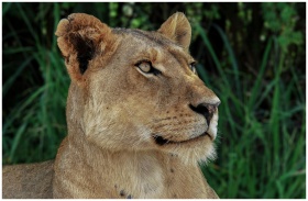 Detailed close-up of a lioness with focused eyes in its natural habitat, showcasing its majestic features.