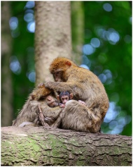 A nurturing Barbary macaque family sits together on a tree, showcasing wildlife bonding.