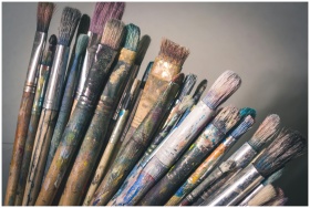 A collection of well-used paintbrushes with colorful paint marks against a neutral background.