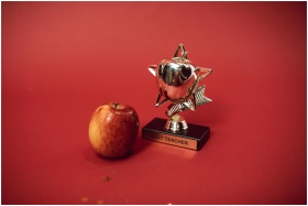 A 'Best Teacher' trophy alongside an apple on a vi