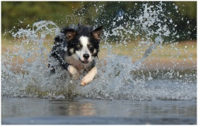 Energetic border collie splashes through water in