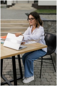 A young woman sitting outdoors, engaging in online learning with a laptop at a table.