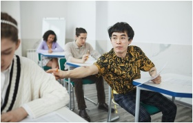 Students engaged in an exam setting, one attempting to view a classmate's paper. High school classroom scene.